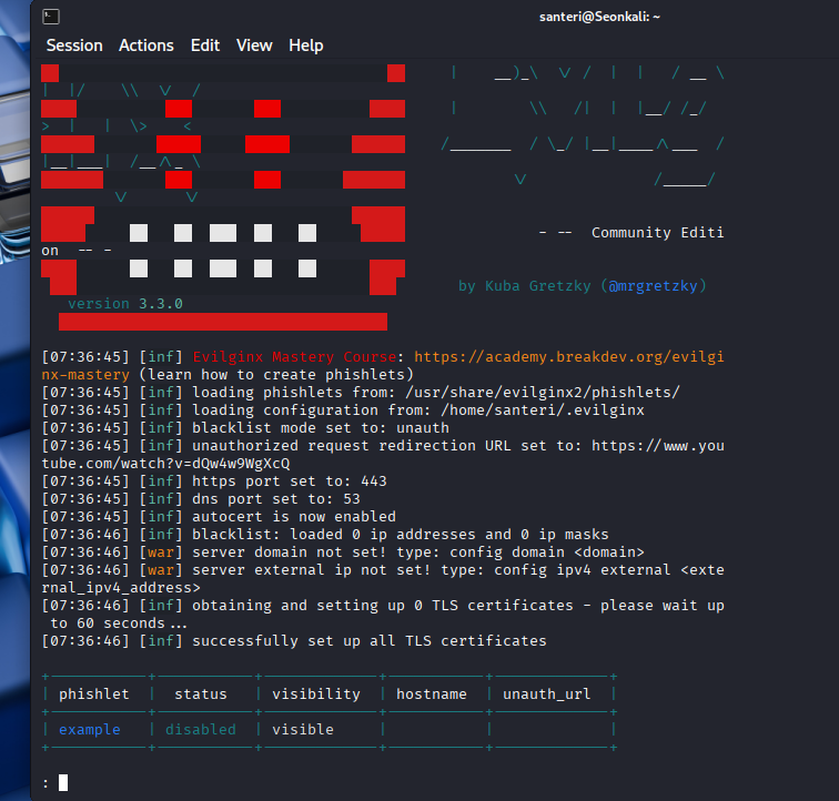 https://nateahess.medium.com/evilginx-on-digitalocean-6f2066e8a468 tällä ohjeella niinkin yksinkertainen asennus ja käynnistys Kali:lla, kuin: