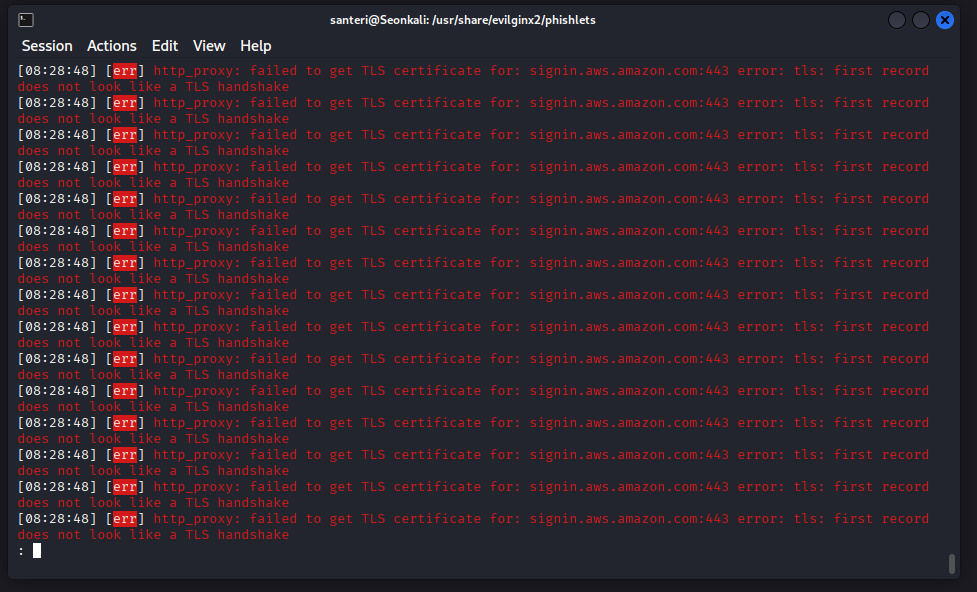 En onnistunut huijaamaan liikennettä näillä ohjeilla. Navigoidessani tuohon edellisen kohdan osoitteeseen, jätin evilginxin päälle. Hetken päästä ruudulle ilmestyi pitkä pätkä seuraavaa: