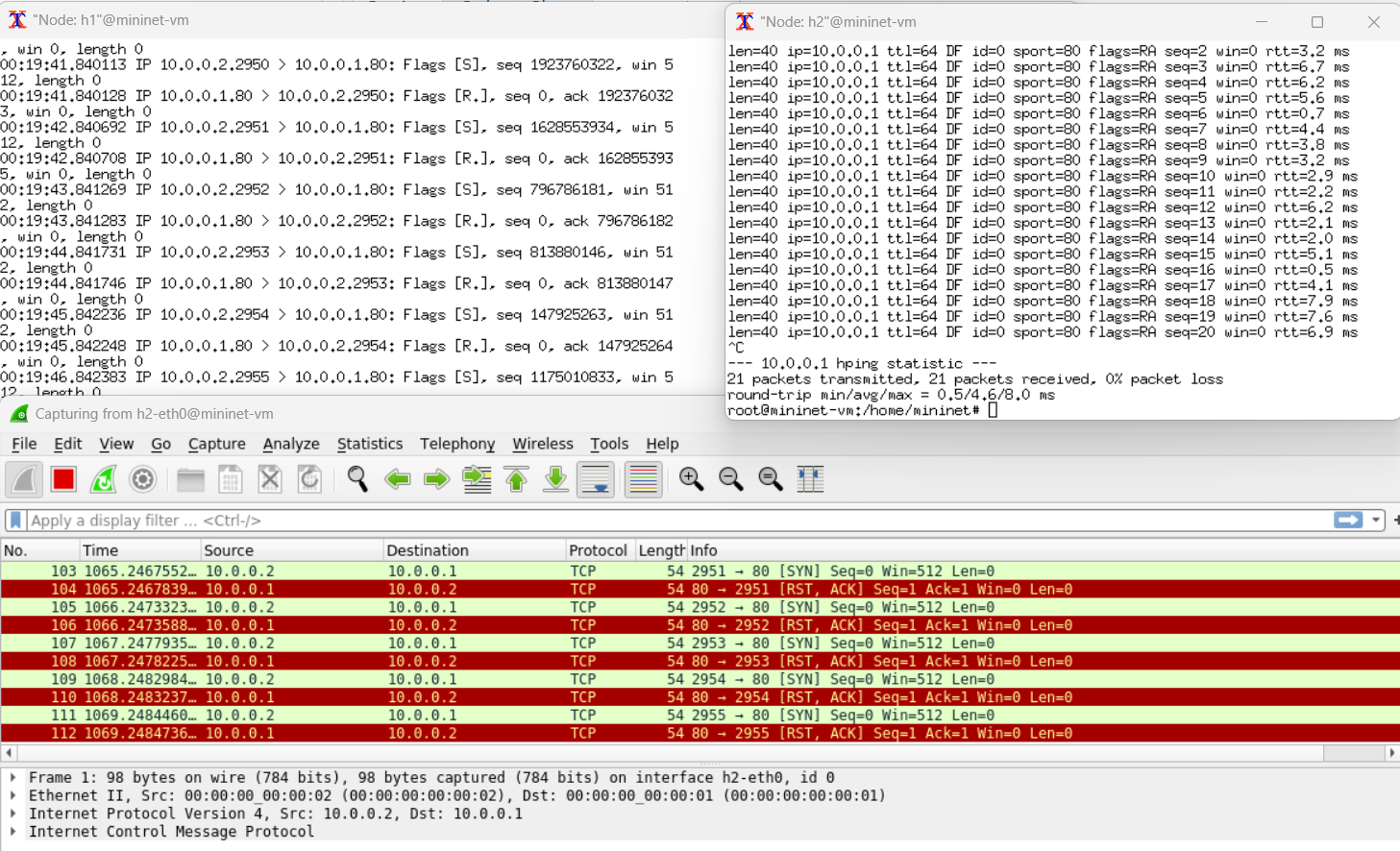 h1:lle annan seuraavan komennon, jolla seuraan portin 80 liikennettä: tcpdump -i h1-eth0 -n tcp port 80 -c 1000 https://danielmiessler.com/blog/tcpdump, https://nanxiao.github.io/tcpdump-little-book/: