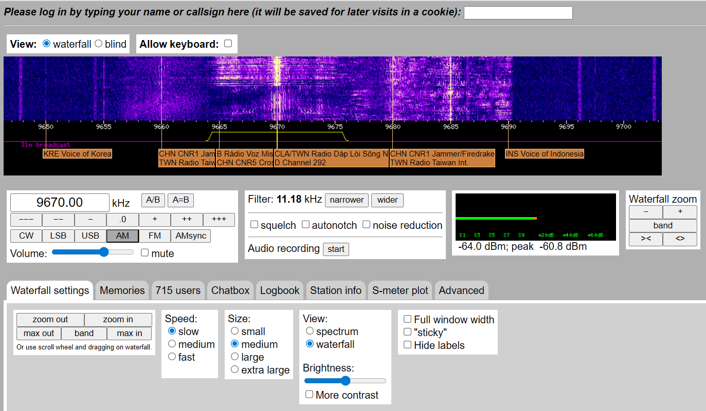 Menin Googlen kautta osoitteeseen http://websdr.ewi.utwente.nl:8901/. Radion on laittanut pystyyn University of Twente Alankomaissa. Säätelin nappuloita ja löysin taajuuden 9670.00kHz, josta kuului AM modulaatiolla hyvän kuuloista vanhaa rockia.