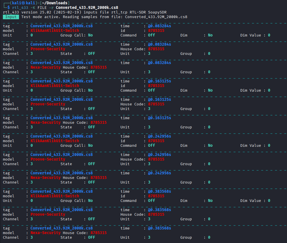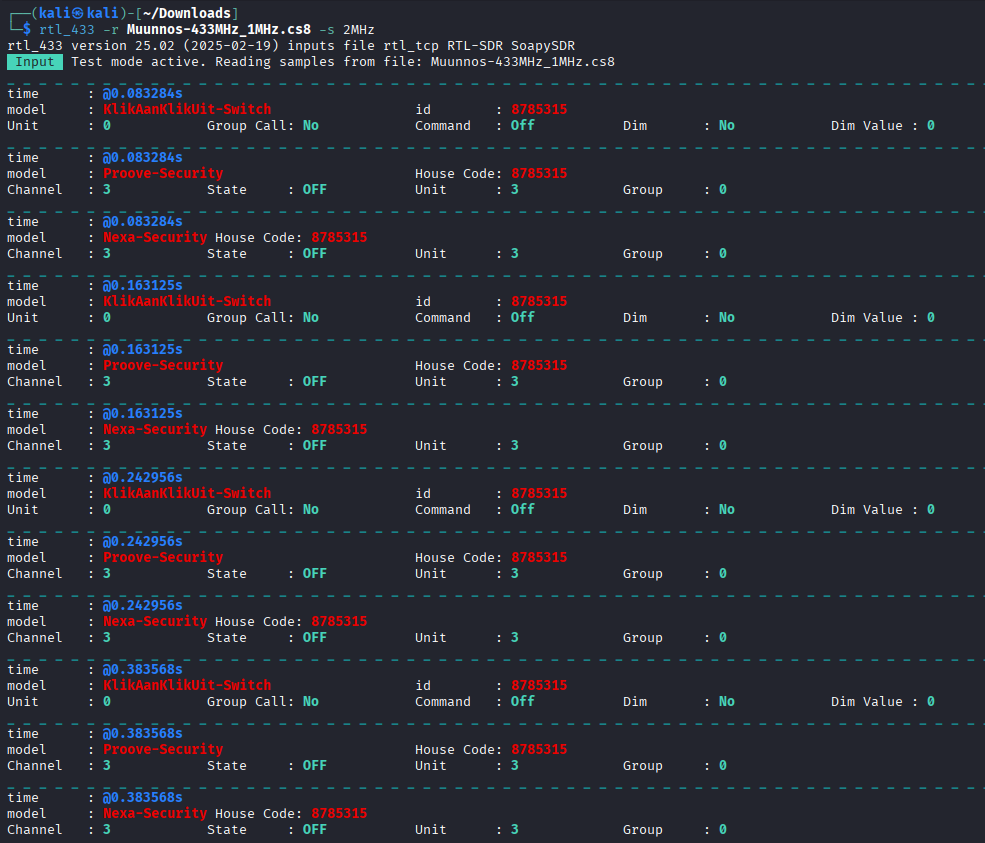 rtl_433 ohjeesta löysin komennon, jolla saa lataamani tiedoston auki: rtl_433 -K FILE -r Converted_433.92M_2000k.cs8. Löysin tunnisteita: