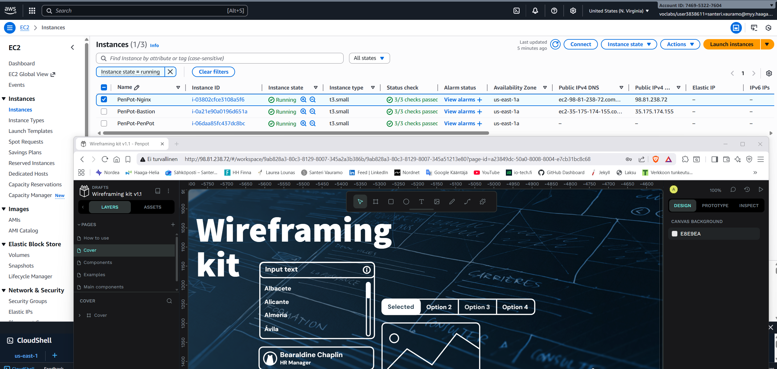 Here is proof of the system in use and working. This is a screenshot of the AWS Management Console showing the 3 EC2 instances, in the lower browser window you can see connection to the Nginx instances IPv4 address and the PenPot app working:
