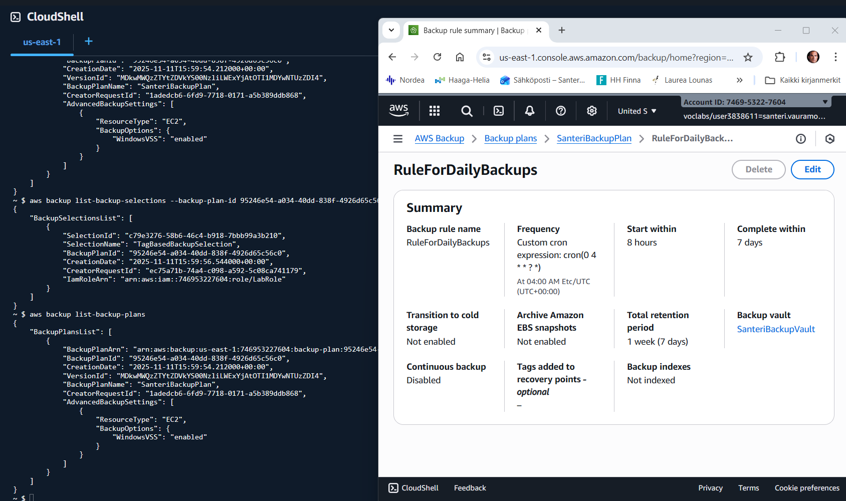 I created a backup vault, backup plan with backups every morning 4:00 o’clock, deleted after 7 days, backups implemented to resources tagged with key: backup and value: dobackup.
