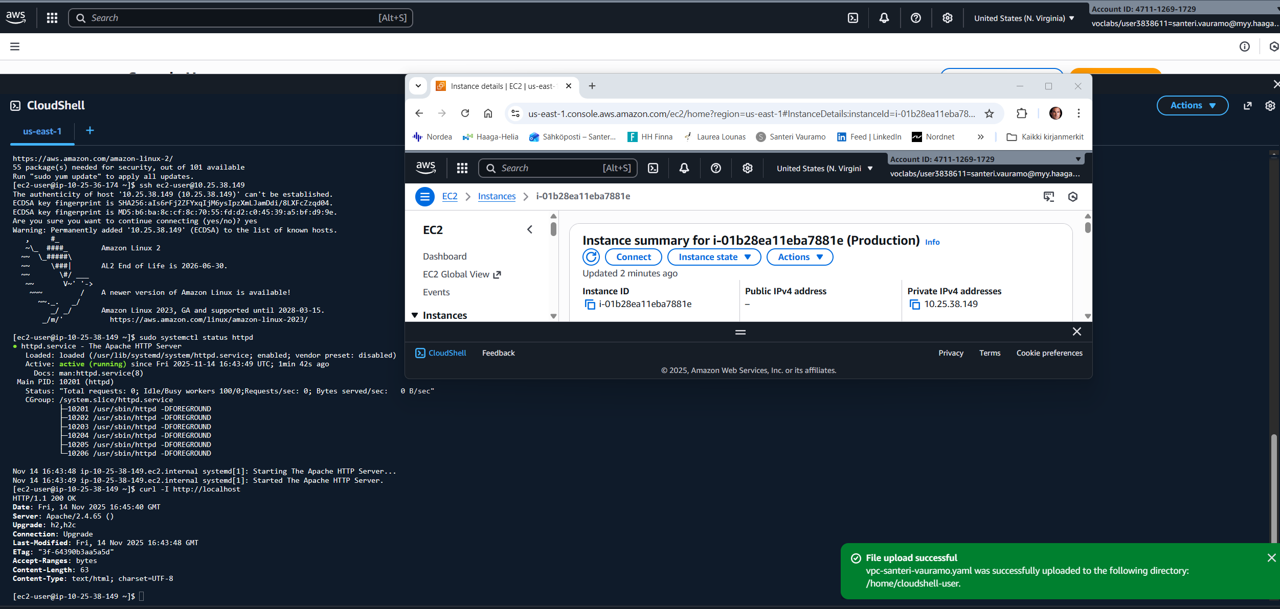 - Upload the CloudFormation template “vpc-santeri-vauramo.yaml” to AWS Learner Lab Cloudshell or SandBox. I actually did this in the SandBox, since it’s much faster to start from scratch. This is handy when fixing errors and testing overall usability.