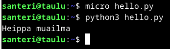 Pikaisen vilkaisun jälkeen otan ensimmäisenä käsittelyyn vanhan kunnon Pythonin. Luon python tiedoston micro hello.py. Kirjoitan tiedostoon: print(“Heippa muailma”) ja tallennan ``ctrl+s´´