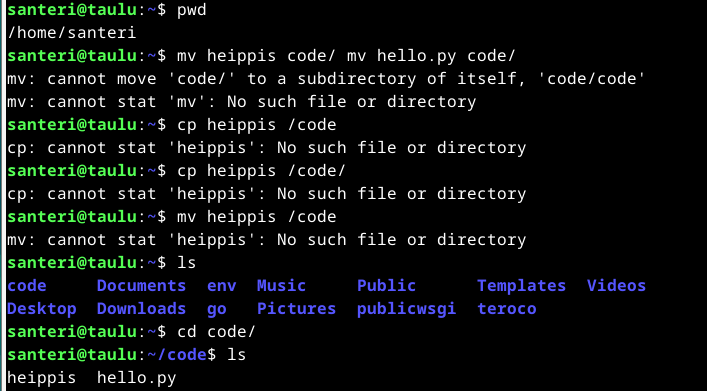 mv heippis.go heippis. Huomaan että olen tehnyt nämä suoraan /home/santeri kansioon, tämä ei vetele, joten teen “code/” kansion minne siirrän nämä. mkdir code, ei sentään c0de, eikä myöskään sammy, mv heippis code/ mv hello.py code/, ihme herjoja tuli, mutta tiedostot siirtyivät /code kansioon