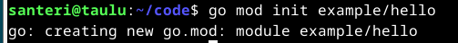 Nyt kokeilen suoraan raa’asti ohjeen mukaan go mod init example/hello