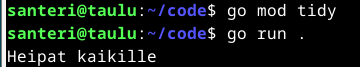 Ohjeen mukaan ajoin seuraavaksi go mod tidy, tästä en ole varma oliko pakollinen vaihe. Seuraavaksi komennolla go run . sain ajettua tuon koodin oikein.