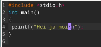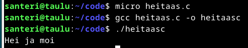 Täytyy vielä laatia .c-tiedostosta ohjelma gcc heitaas.c -o heitaasc, nyt ohjelmaa voidaan ajaa komennolla ./heitaasc