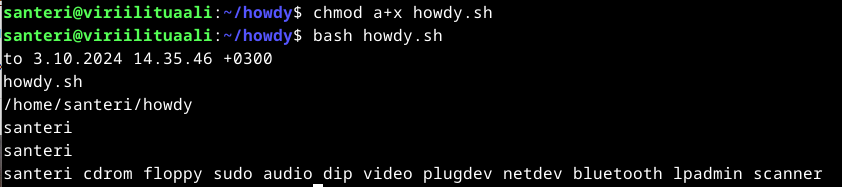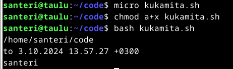 Annan kaikille oikeudet suorittaa tiedosto komennolla chmod a+x kukamita.sh, jonka jälkeen suoritetaan tiedosto komennolla bash kukamita.sh