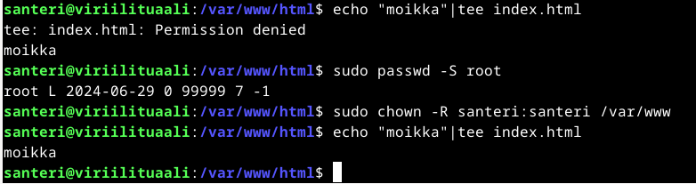 Laitoin oikeudet chmod -R 750 /var/www ja sudo chown -R santeri:santeri /var/www