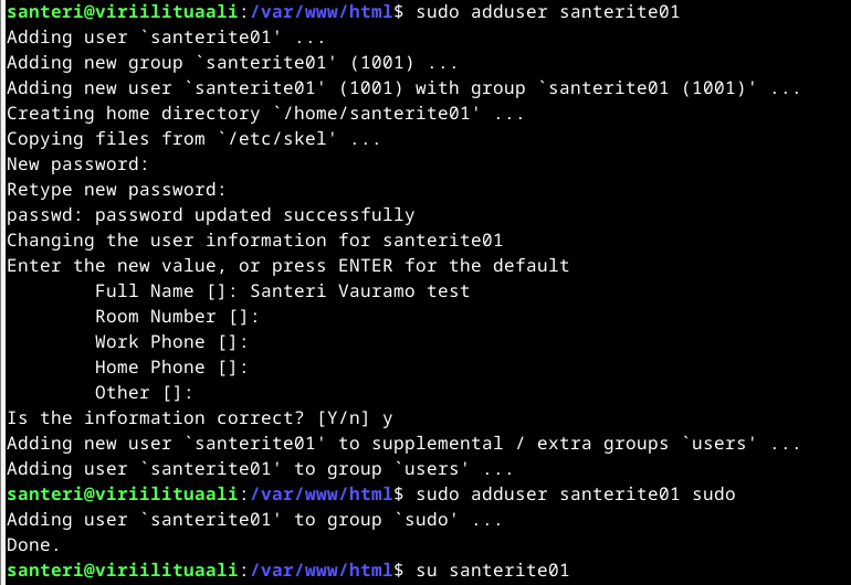 - Tee uusi käyttäjä omalla nimelläsi, esim. minä tekisin “Tero Karvinen test”, login name: “terote01”