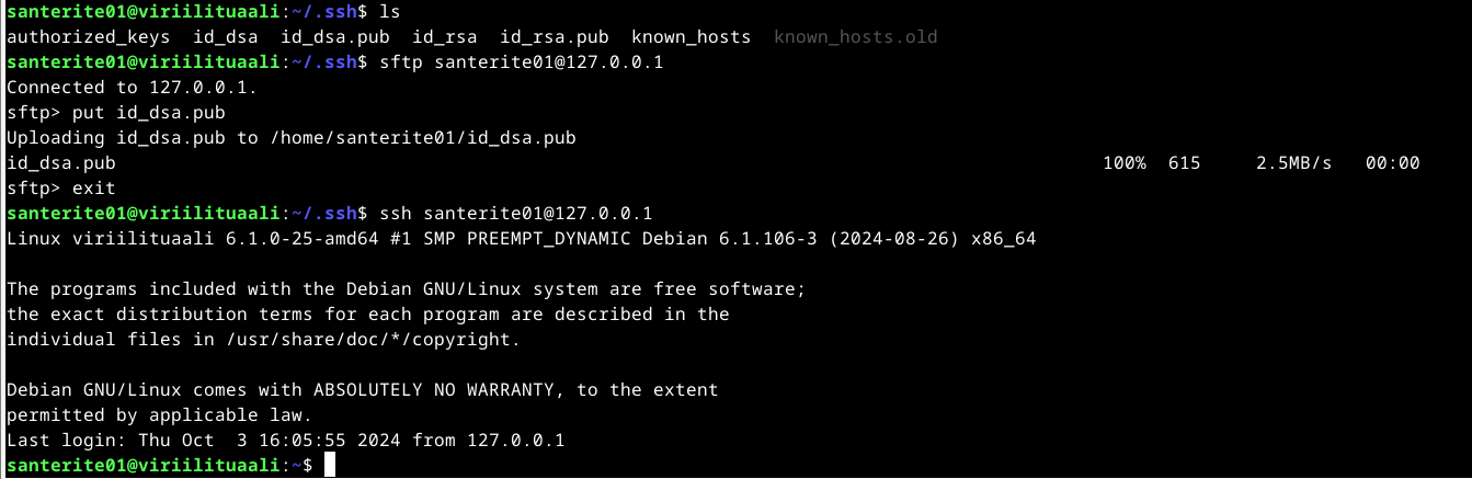 - Automatisoi ssh-kirjautuminen julkisen avaimen menetelmällä, niin että et tarvitse salasanoja, kun kirjaudut sisään. Voit käyttää kirjautumiseen localhost-osoitetta
