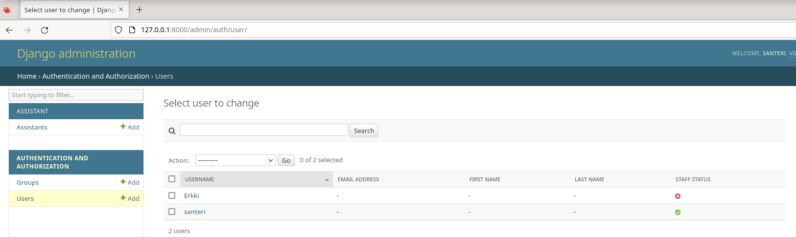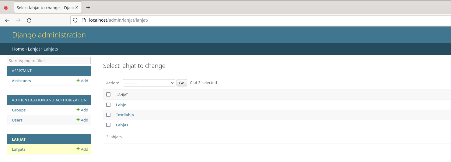 - Tietokannan muokkaus wepissä Djangon omalla ylläpitoliittymällä (Django admin)
