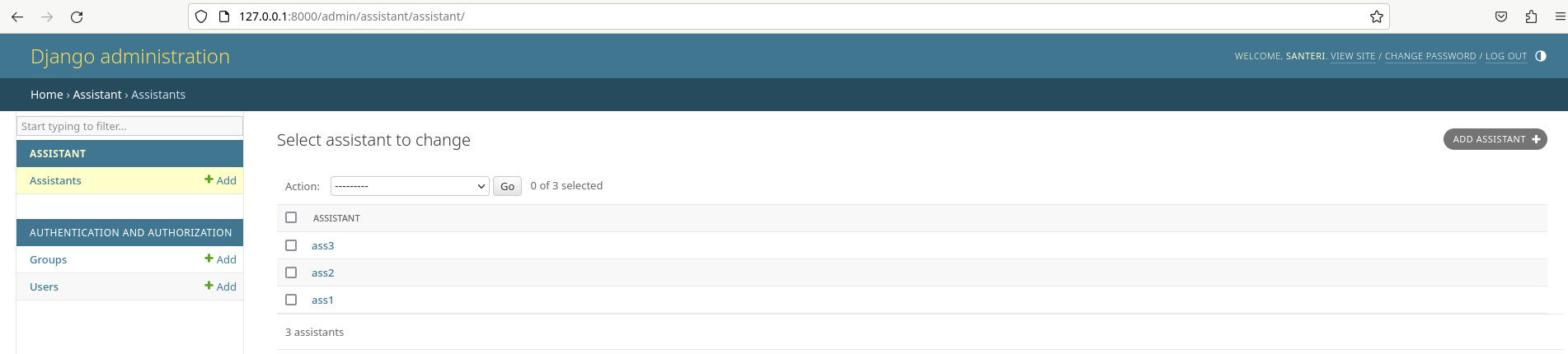 - Taulu Assistants, jossa jokaisella tietueella on nimi (name)