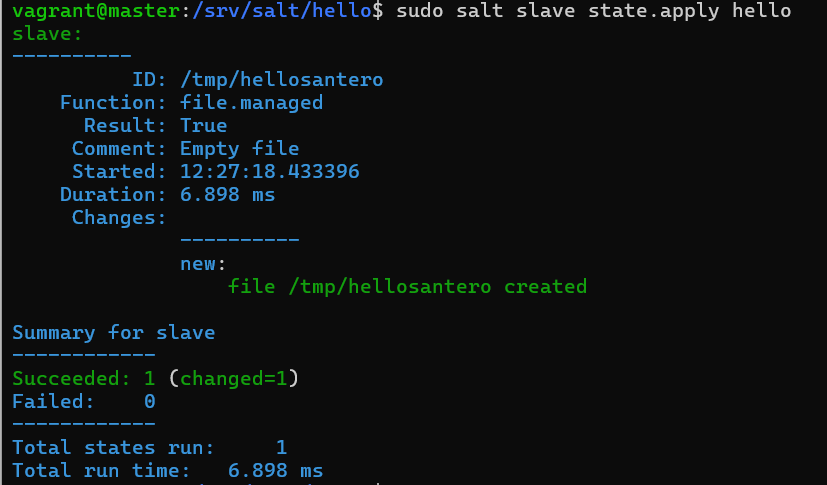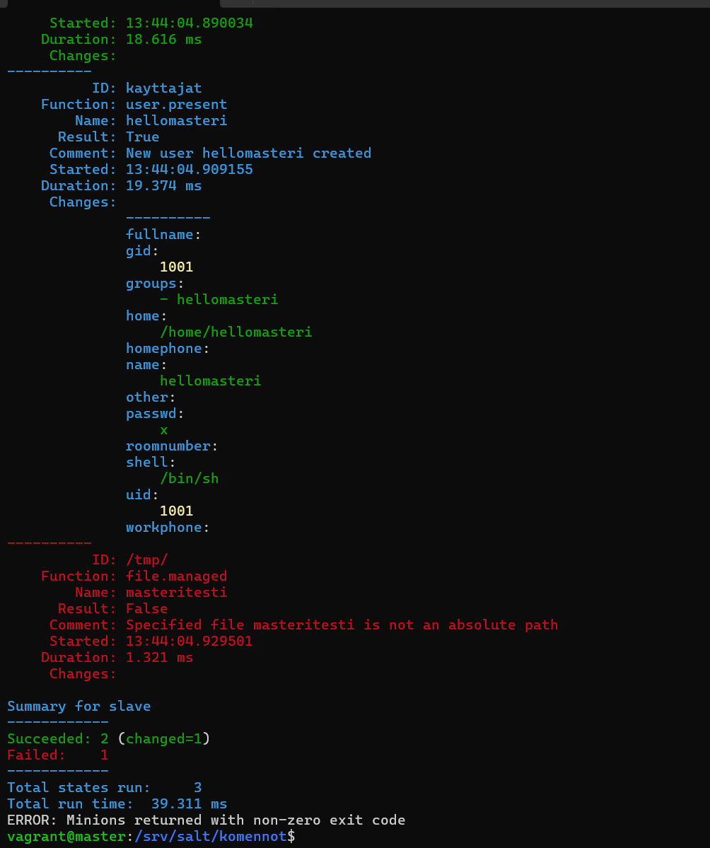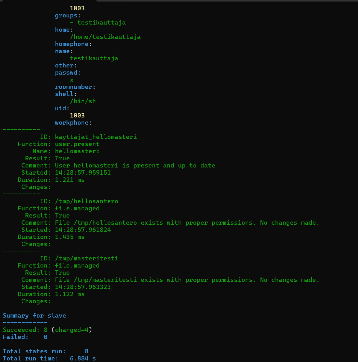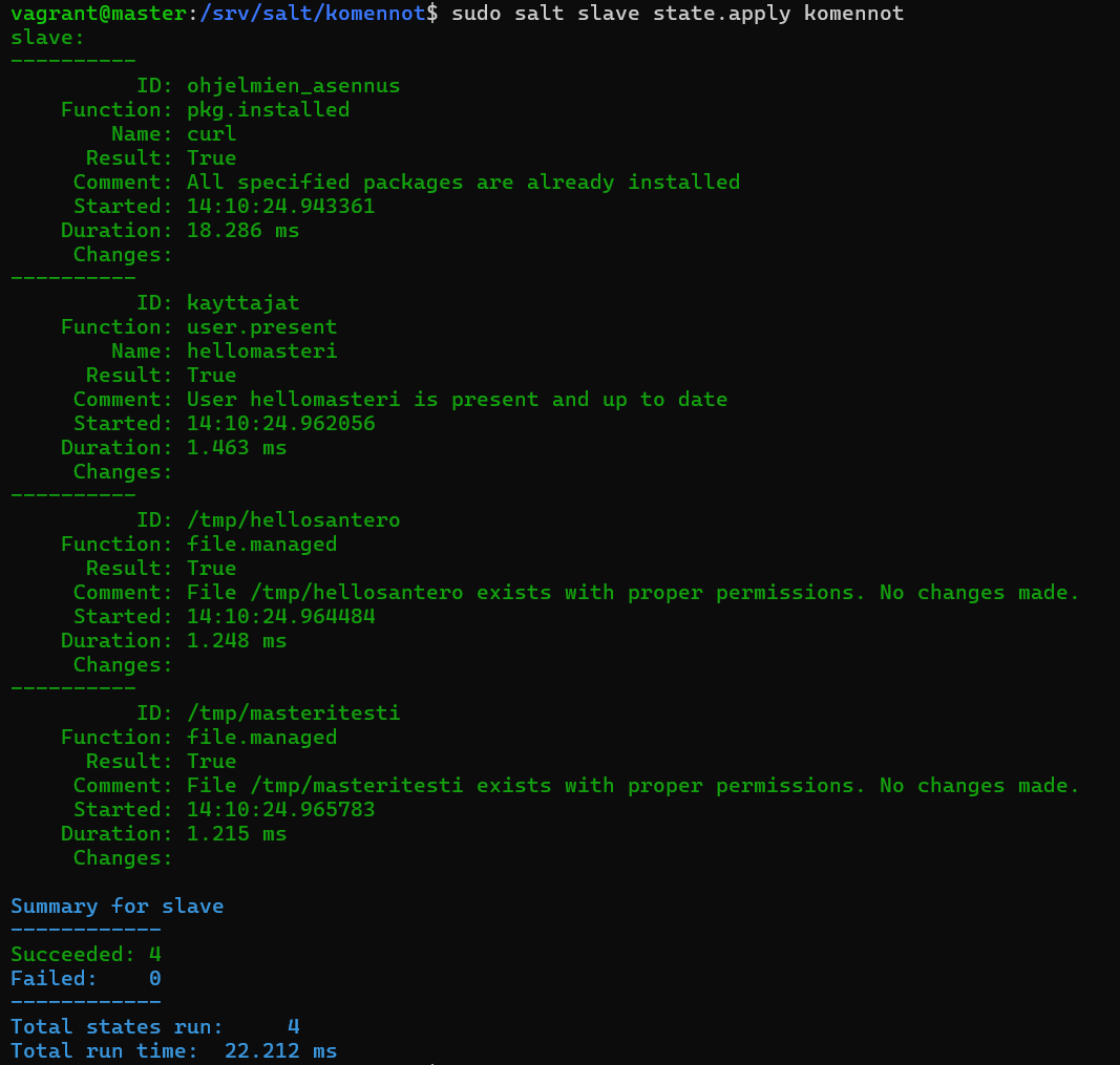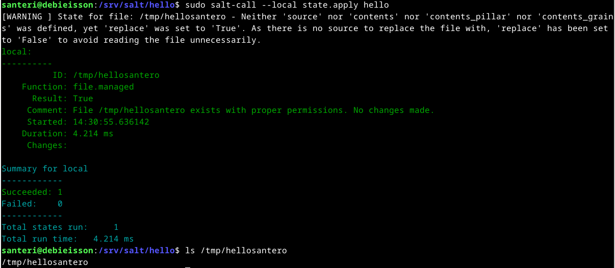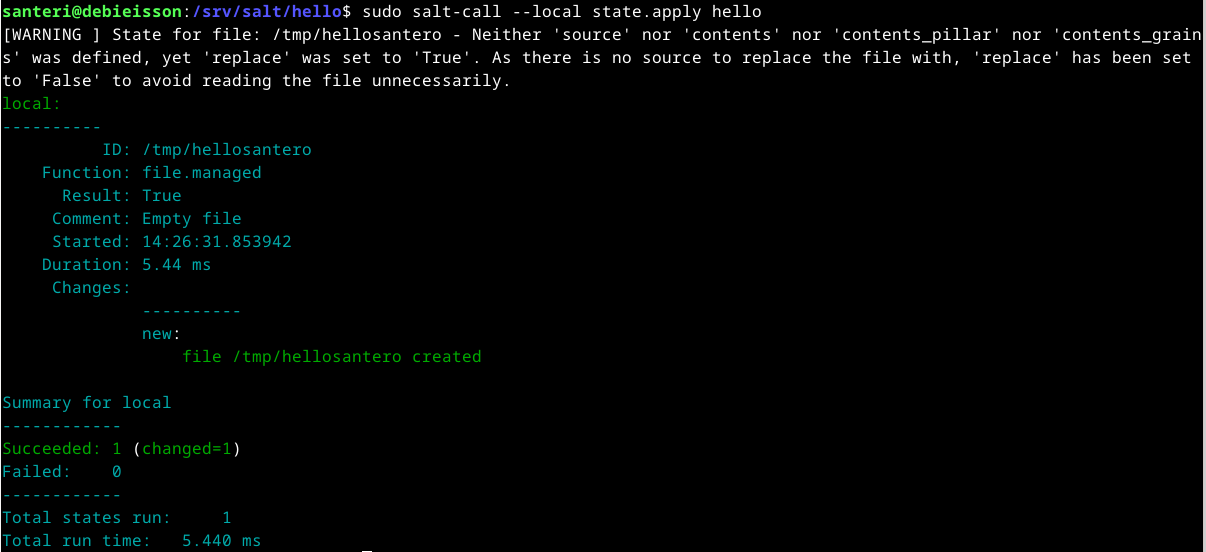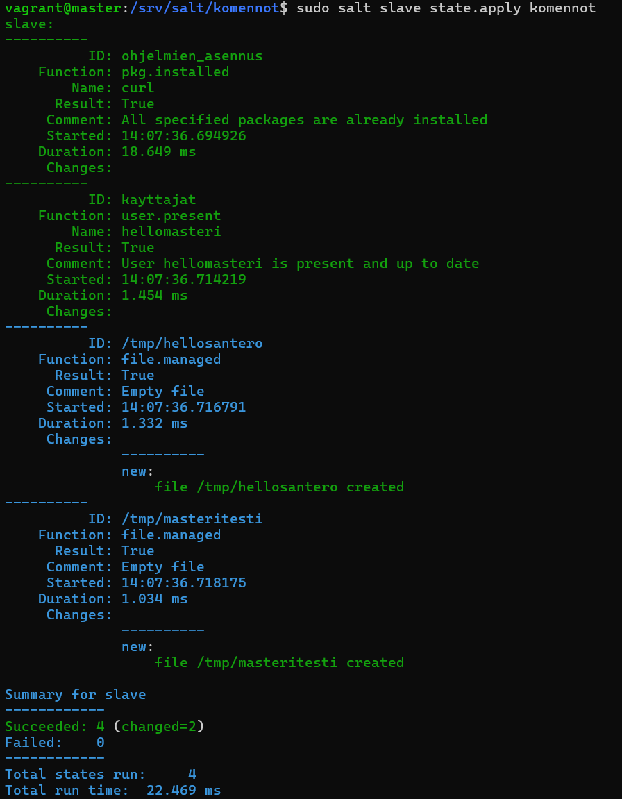 Nyt komentoa ajaessa ei tule virheitä, Salt ilmoittaa, että molemmat tiedostot on luotu