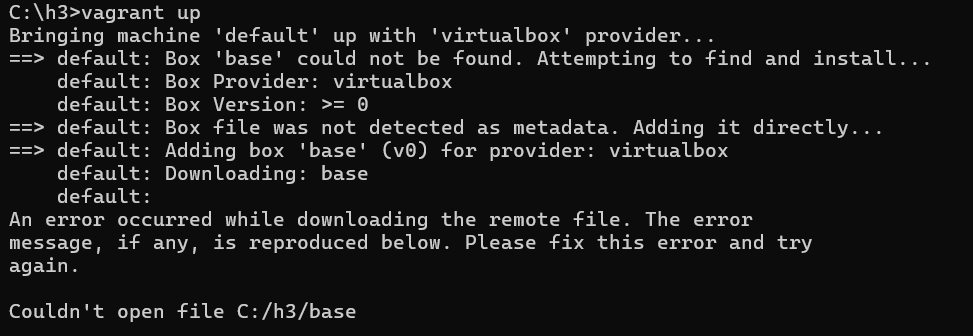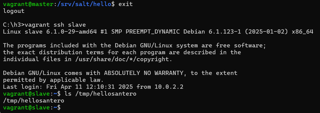 Luon Windowsissa kansion h3/ ja teen sinne Vagrantfilen, jossa on “master” ja “slave”