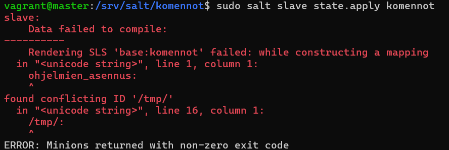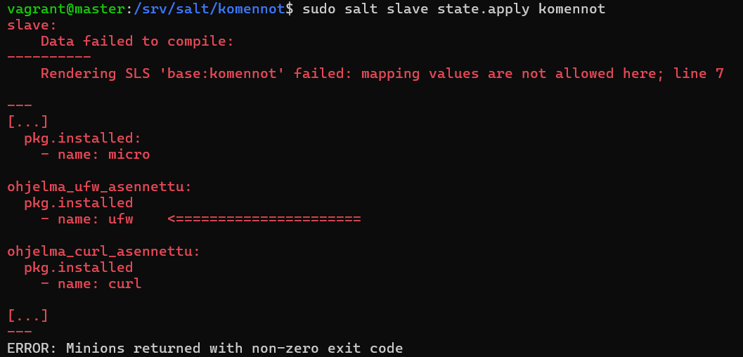vagrant ssh master cd /srv/salt sudo mkdir komennot cd komennot/ sudoedit init.sls
