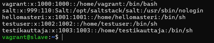 Käyn antamassa slave:lle masterin osoitteen, käynnistän slaven salt-minion ohjelman uudelleen ja käyn masterilla hyväksymässä slaven id:n
