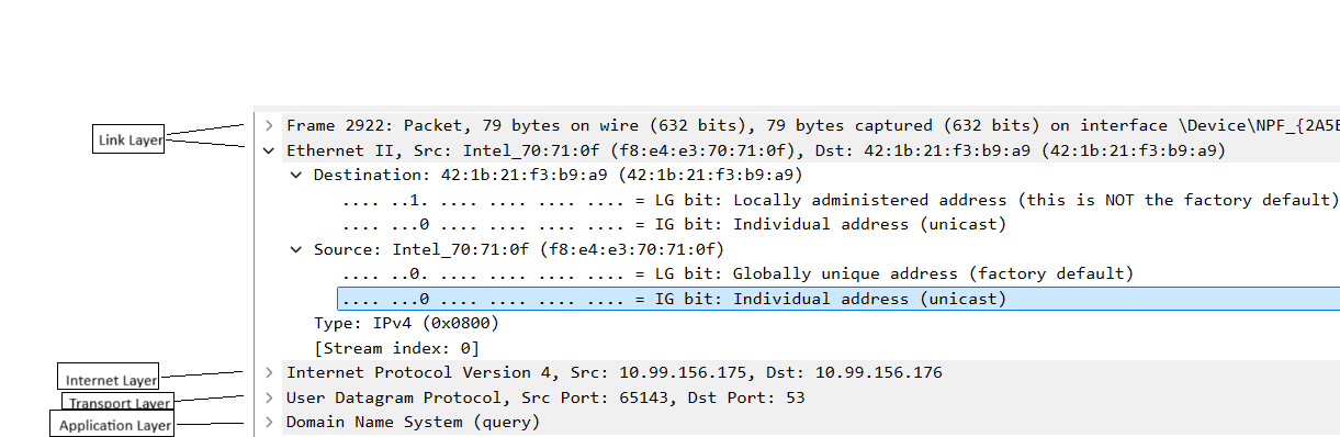 Tässä tehtävässä on ideana ainoastaan osoittaa Wireshark kuvankaappauksessa näkyvät Application, Transport, Internet, ja Link layer