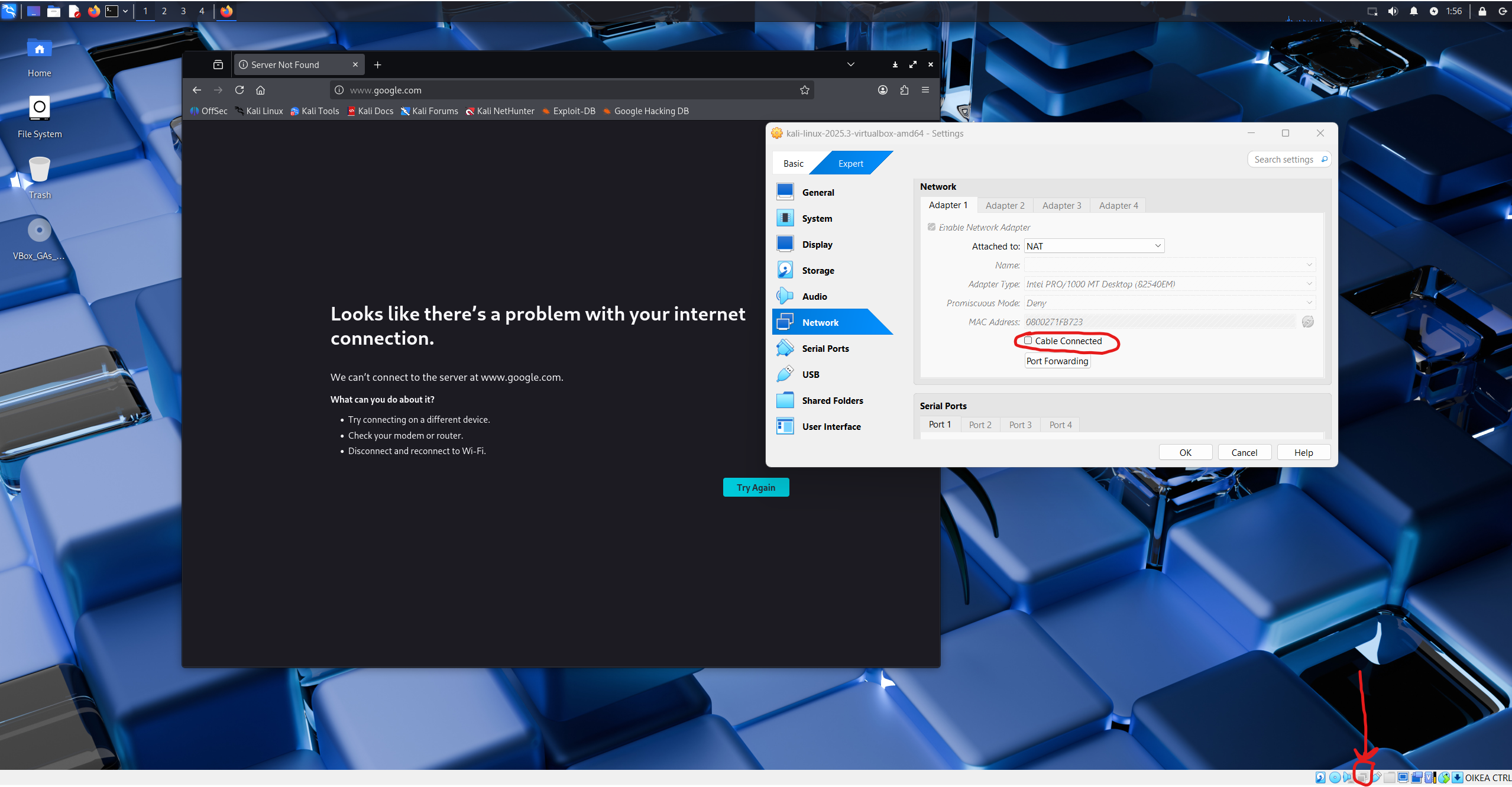 - Sieltä virtuaalisesti kaapeli irti (täppä pois “Cable Connected”-kohdasta.