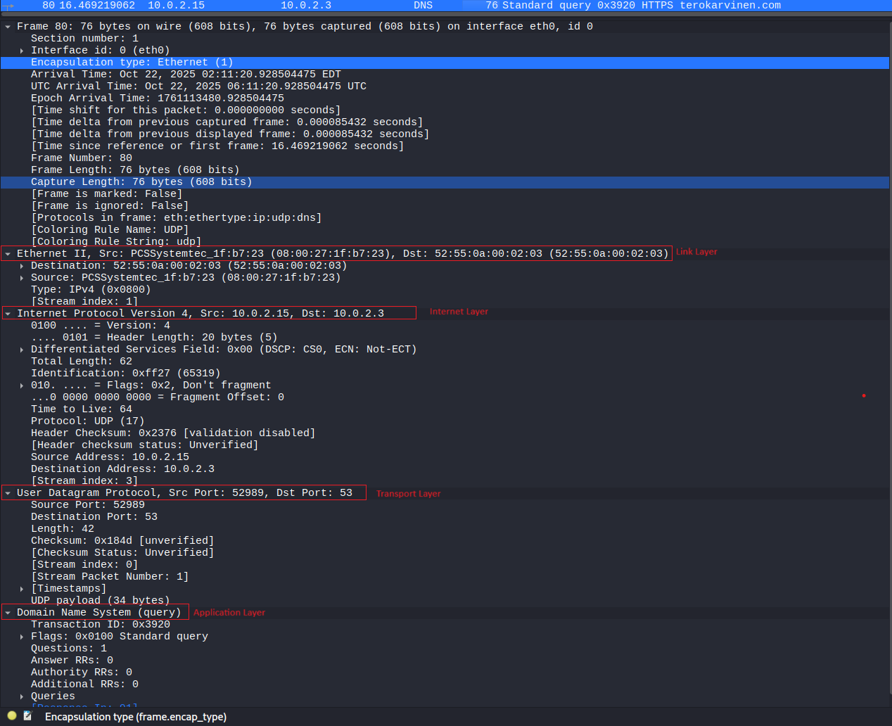 d) Oikeesti TCP/IP. Osoita TCP/IP-mallin neljä kerrosta yhdestä siepatusta paketista. Voit selityksen tueksi laatikoida ne ruutukaappauksesta. (Voit käyttää vastauksesi osana ruutukaappaustasi h0-tehtävästä, mutta tässä tehtävässä tarvitaan myös sanallinen selitys.)