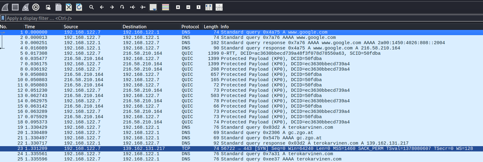 - Protokollia: IPv4, QUIC, DNS, TCP, TSL, ARP.
