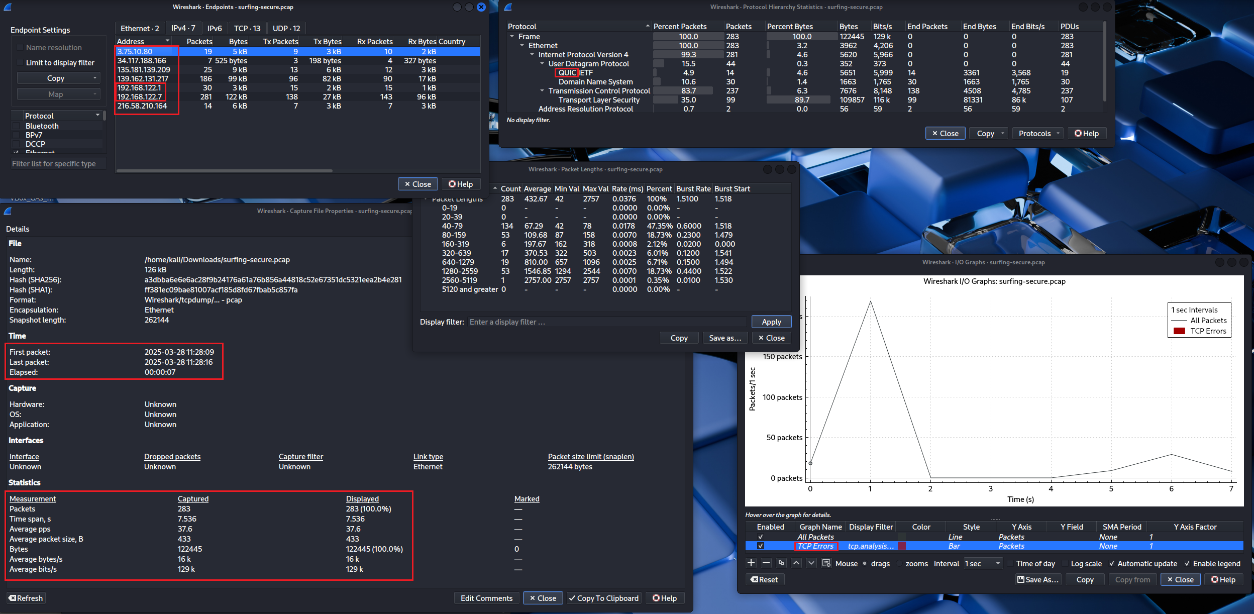 e) Mitäs tuli surffattua? Avaa surfing-secure.pcap. Tutustu siihen pintapuolisesti ja kuvaile, millainen kaappaus on kyseessä. Tässä siis vain lyhyesti ja yleisellä tasolla. Voit esimerkiksi vilkaista, montako konetta näkyy, mitä protokollia pistää silmään. Määrästä voit arvioida esimerkiksi pakettien lukumäärää, kaappauksen kokoa ja kestoa.