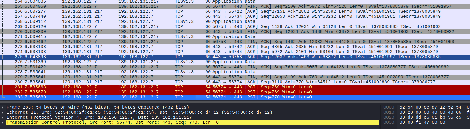Viimeisessä kuvassa kaappauksen lopussa tapahtuu TCP yhteyden lopetuksen kättely: