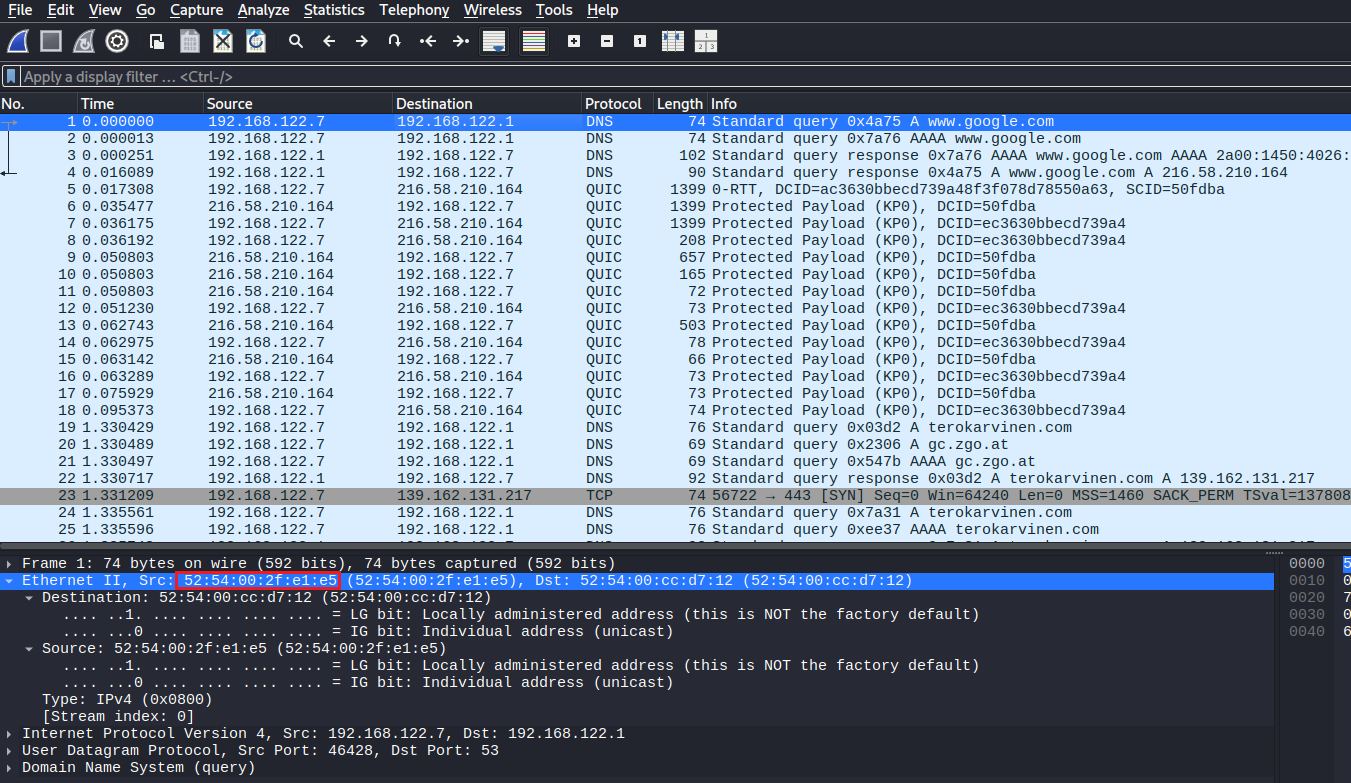 Tutkin ensimmäisen paketin DNS kyselyä. Source MAC osoite on 52:54:00:2f:e1:e5, josta ensimmäisen puoliskon (52:54:00) pitäisi kertoa mikä valmistaja on kyseessä (https://dnschecker.org/mac-lookup.php). Tässä tapauksessa mikään internetin MAC kyselyistä ei löytänyt mitään, olikohan kysymys kompa?