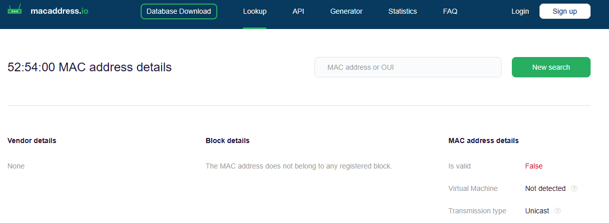 https://macaddress.io/mac-address-lookup/85EQoqbm5e Kyselyllä 52:54:00 tuli seuraavanlainen vastaus: