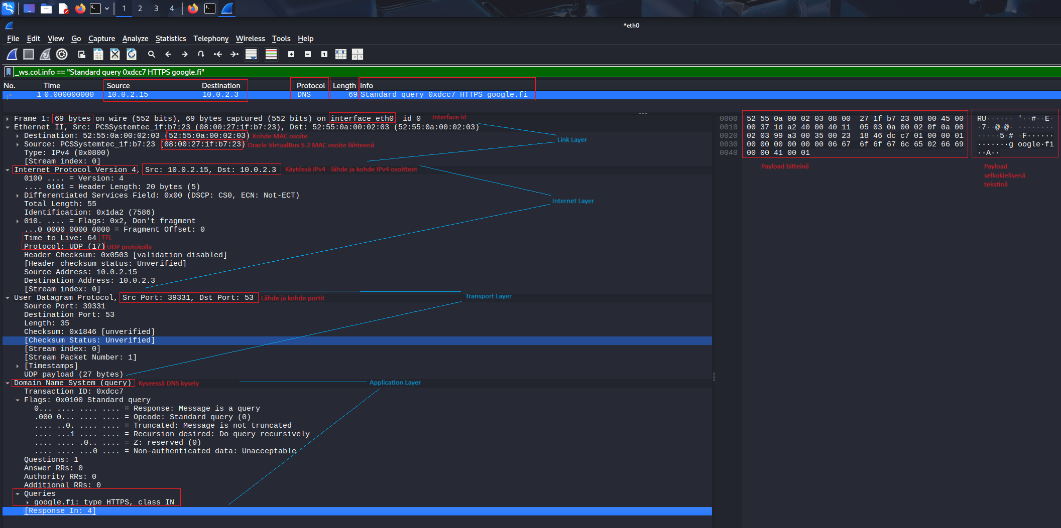 - Frame: 69 tavua pitkä. Interface id eth0 on vanhaa perua 90-luvulta https://wiki.debian.org/NetworkInterfaceNames.