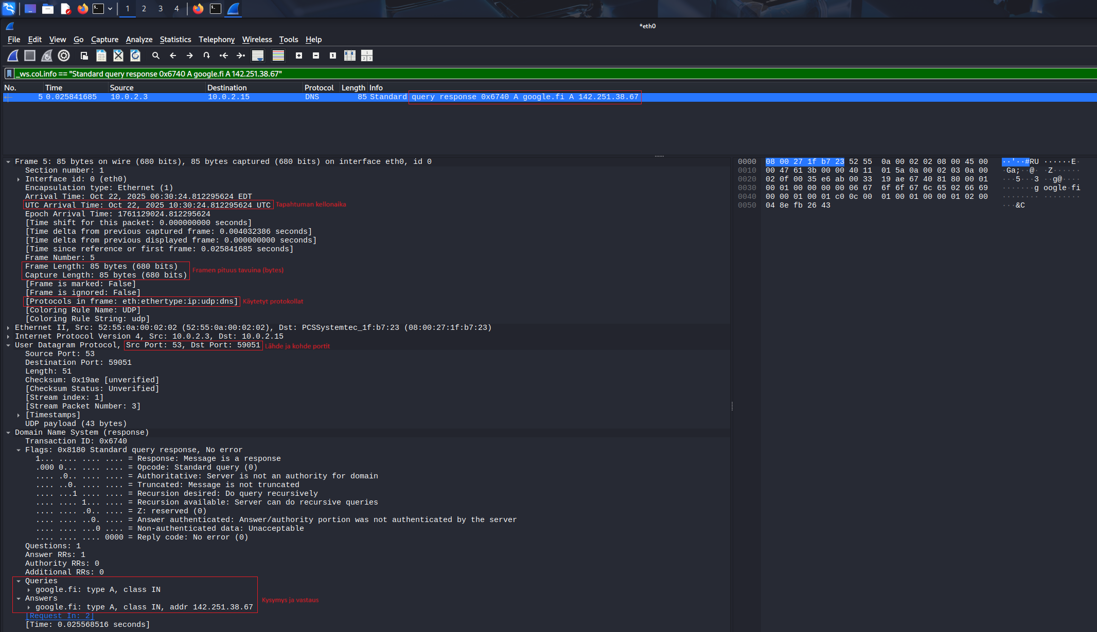 Tässä siis tapahtuu DNS nimikysely google.fi:lle. Merkitsin kuviin punakynällä asioita.